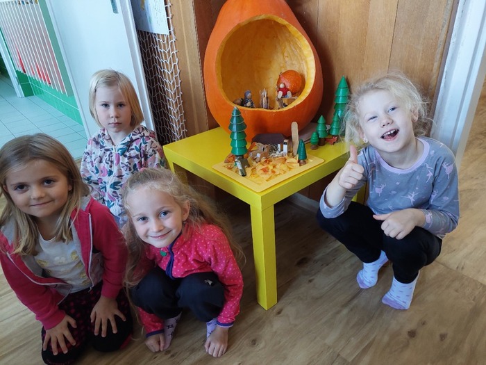 Náplní tohoto týdne byly hry s dýněmi. Obrovskou dýni, kterou nám věnoval pan Vašek, jsme společně vydlabali a využili na výtvarné vyjádření pohádky Jak dědeček dýni zasadil. Tuto pohádku jsme také dramatizovali. Zbytek dýně jsme využili k polytechnickým činnostem. Pomůcky s vyobrazením dýní jsme počítali, skládali, malovali. Dýně jsme vozili na vozíku slalomem ve sportovních aktivitách. Nalezená semínka z dýně jsme počítali, lepili, cvičili jsme s nimi. Děti se seznamovaly s programováním, kreslily dýně na interaktivní panel. Krásné podzimní počasí nás lákalo ven do parku ke hrám, objevování i zkoumání. Děti si vyzkoušely netradiční kreslení a malování pod stolem.