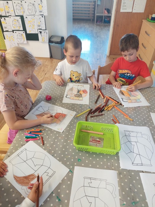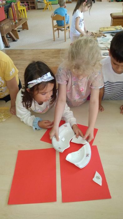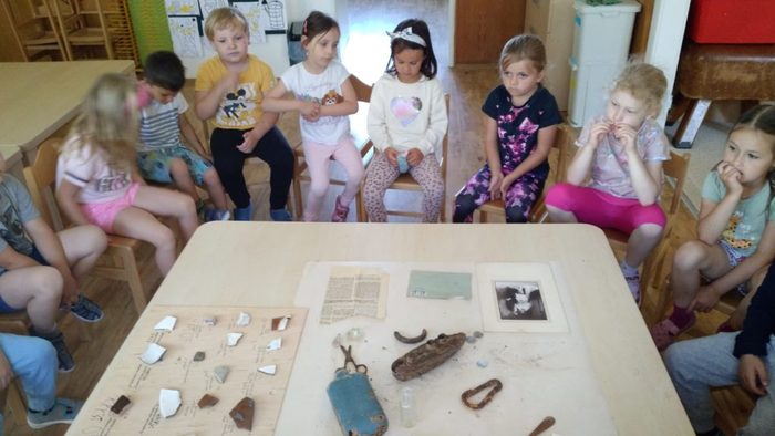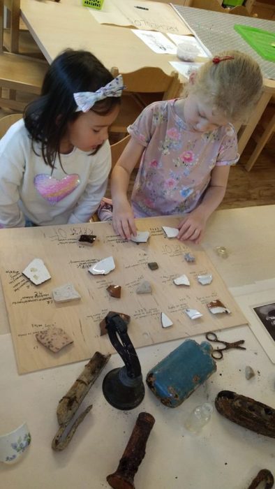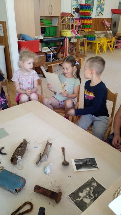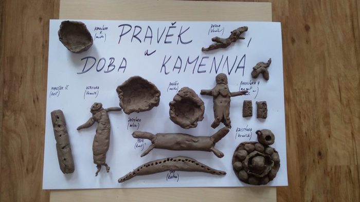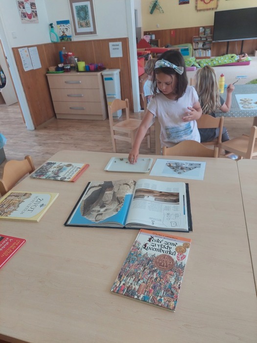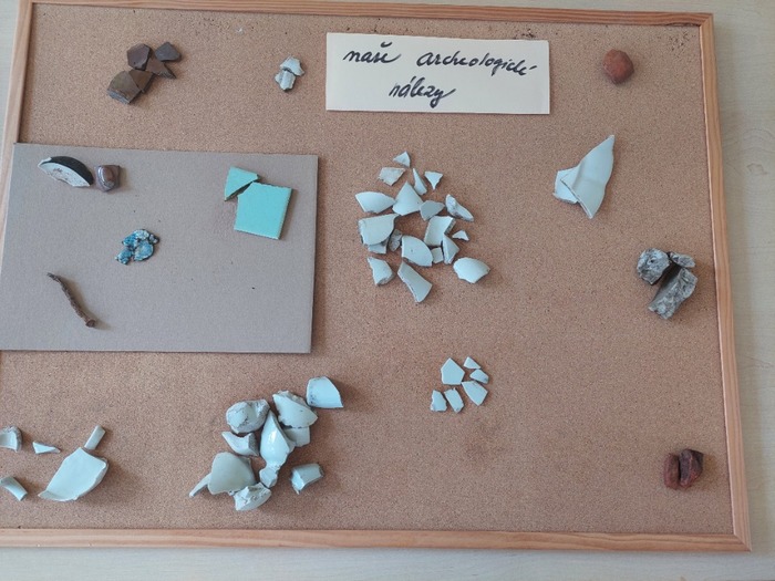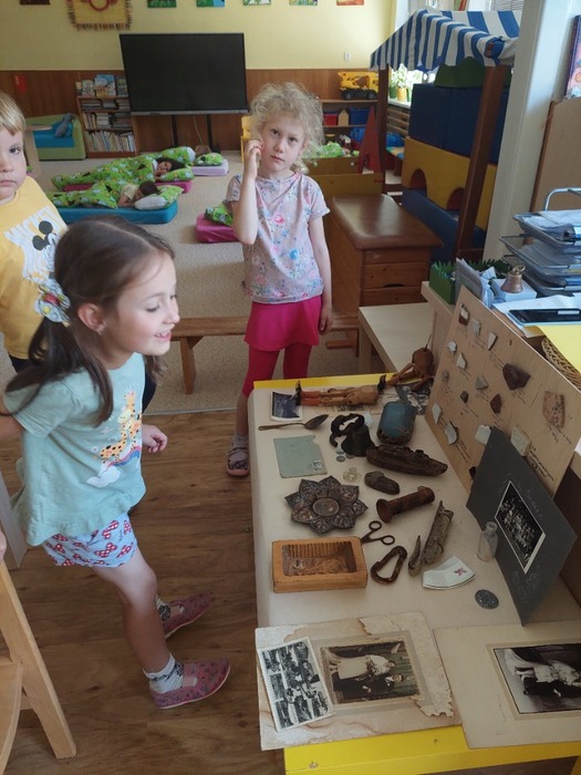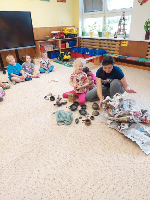Děti se seznamovaly s rozdíly pojmu co bylo, co bude. Seznámily se s pojmem historie, archeologie, památky, nález. Zkoumaly encyklopedie o historii. Hledaly zajímavé úlomky nádob v zámeckém parku. Nálezy třídily, vymýšlely k nim příběhy. Nainstalovali jsme si ve třídě malé muzeum. Vytvořili jsme sbírku archeologických nálezů. Zahráli jsme si na restaurátory. Přivítali jsme v naší MŠ archeoložku paní Andreu, která vyprávěla dětem o době kamenné. Donesla na ukázku spoustu zajímavých artefaktů, včetně kopie Věstonické Venuše. Děti malovaly mamuta, vyráběly poklady, vybarvovaly starý džbán, modelovaly pravěké nádoby a sošky, nalepovaly a domalovaly egyptské památky a mnoho dalších zajímavých činností.