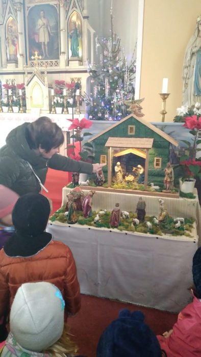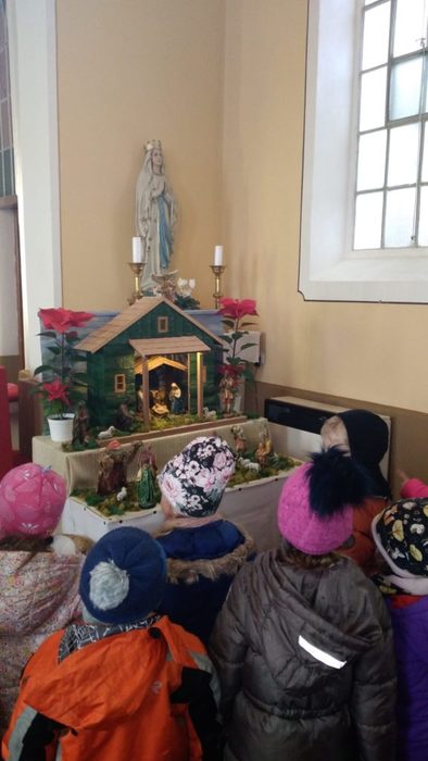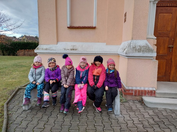 Při pobytu venku si děti prohlédly sochy Betlému u kaple. Zvláště zajímavé bylo setkání s panem Milanem Kučerou v kapli. Děti si prohlédly historické figurky Betléma v kapli. Vyslechly si zajímavé povídání o darech tří králů, historii, kapli i kyjovickém znaku.
