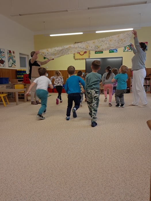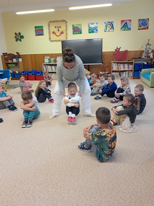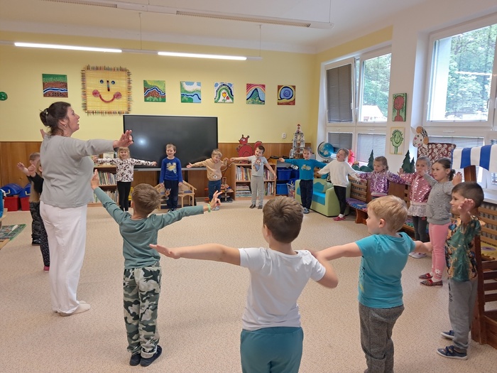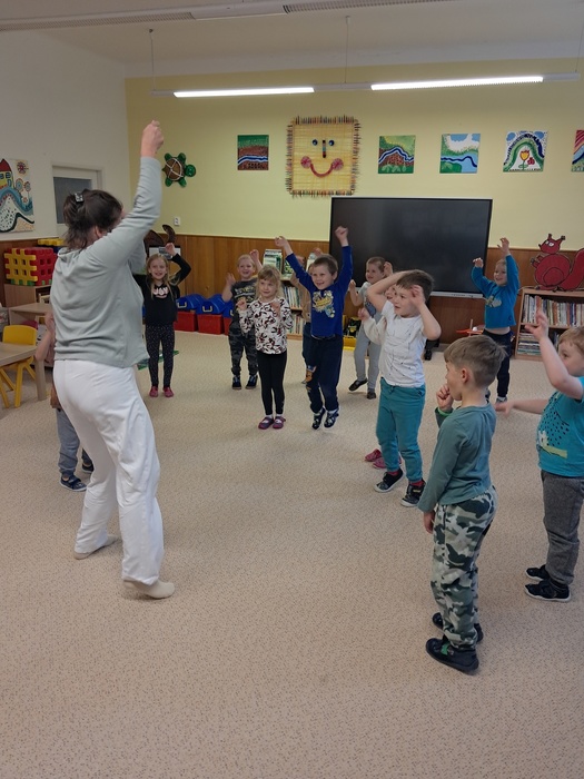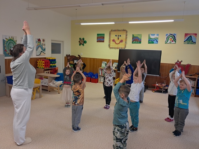 Na konci týdne si děti zasloužily zajímavé zklidňující cvičení spojené s relaxací. Navštívila nás lektorka paní Renáta Mojžyszová a provedla děti cvičením v kruhu, na překážkové dráze a také pohybovými aktivitami s hudbou.
