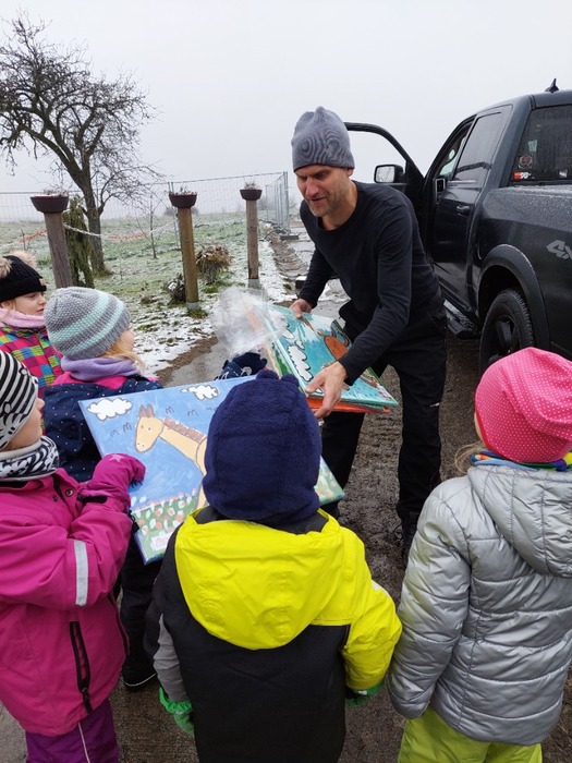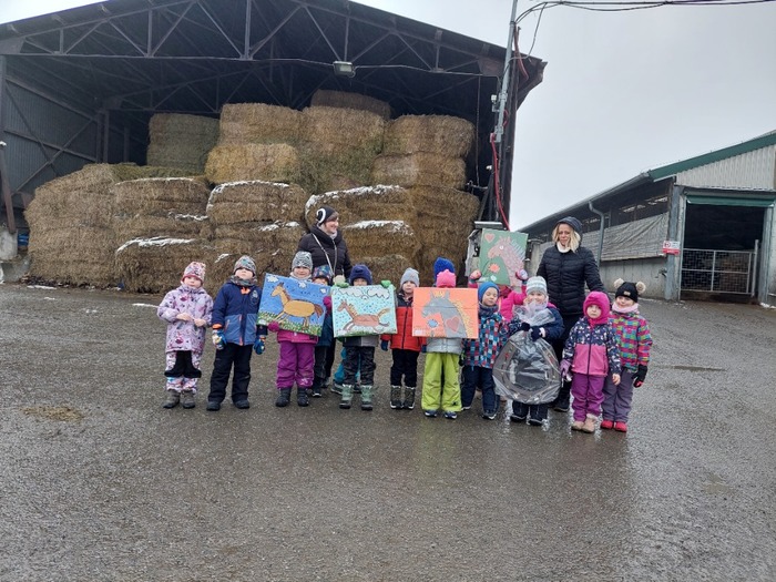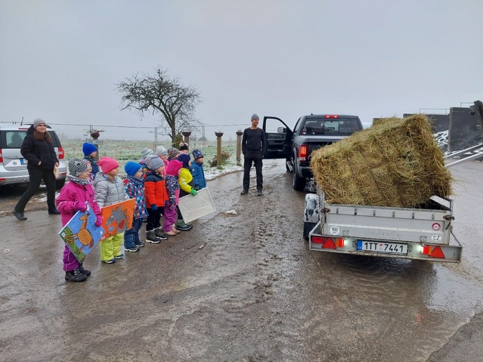 Za utržené peníze z prodeje keramických koníků, které děti vyrobily, jsme koupili v místním zemědělském družstvu veliký balík sena pro koně k Vánocům. Osobně jsme s dětmi domluvily naložení sena zemědělskou technikou a převoz sena do Stáje Mešnice. Hodný pan Marek nám seno i obrazy odvezl na určené místo. Moc se děti těší na jaro, kdy se ke koním vrátíme.