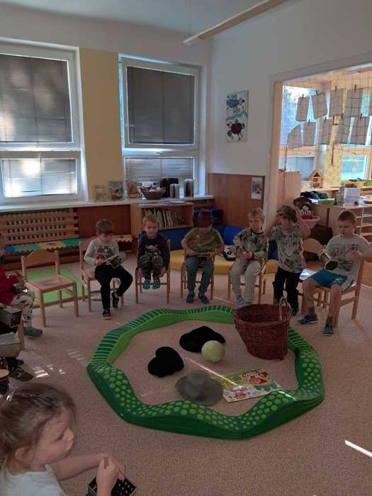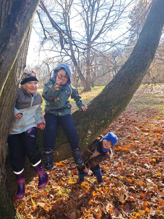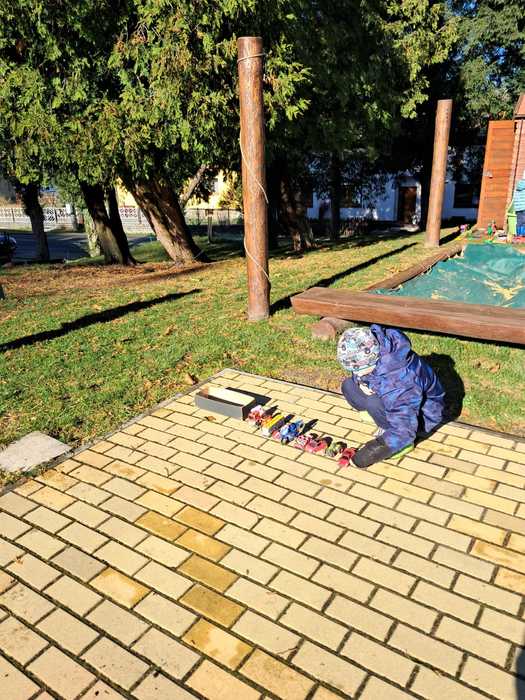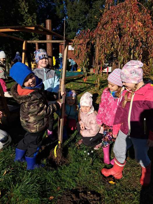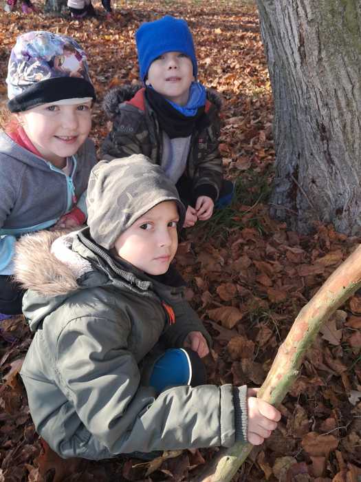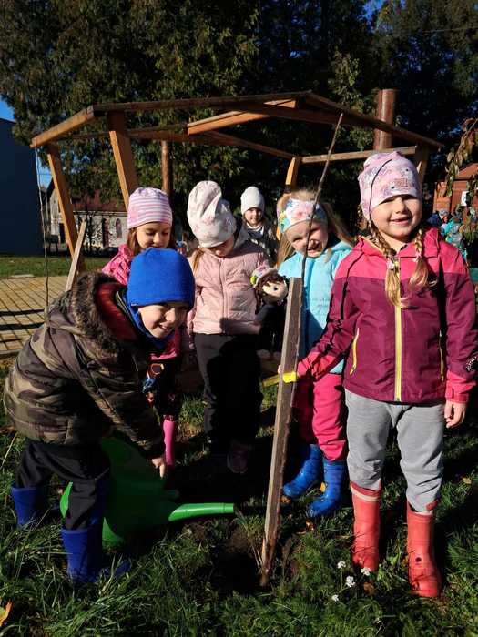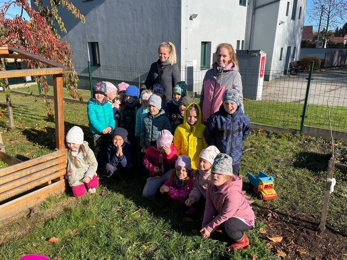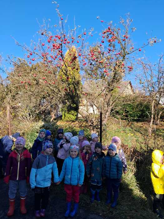 A protože už je listopad a to je nejvhodnější měsíc v roce k výsadbě stromků, zasadili jsme si společně dvě jabloně na školkovní zahrádce. Povídali jsme si o tom, že až za pár let půjdou děti, které stromy zasadily ze školy kolem, budou si moci utrhnout jablíčka. Diskuze nás inspirovala k průzkumu vesnice a pokračovali jsme tedy Kyjovicemi najít stromy s jablíčky. Sluníčko nás hřálo do zad a moc jsme si to užívali. Našli jsme mnoho odrůd jabloní.