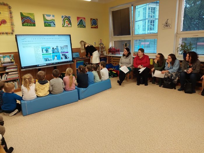 V úterý proběhla ve třídě Pastelka "Ukázková hodina" pro rodiče předškoláků. Děti zpívaly, vytleskávaly rytmus, kreslily ve dvojicích, pracovaly s interaktivní tabulí a vkládaly dílky puzzle. Proběhla ukázka k předčtenářským dovednostem a také předmatematickým představám. Po celou dobu byla přítomna speciální pedagožka paní Mgr. Hana Schindlerová, která po ukázce vysvětlila výsledky depistáží dětí a byla k dispozici ke konzultaci rodičům.