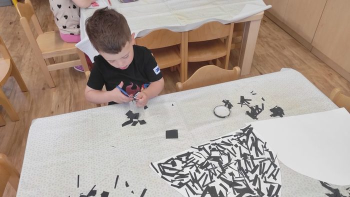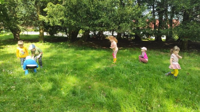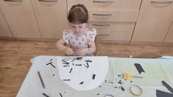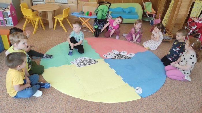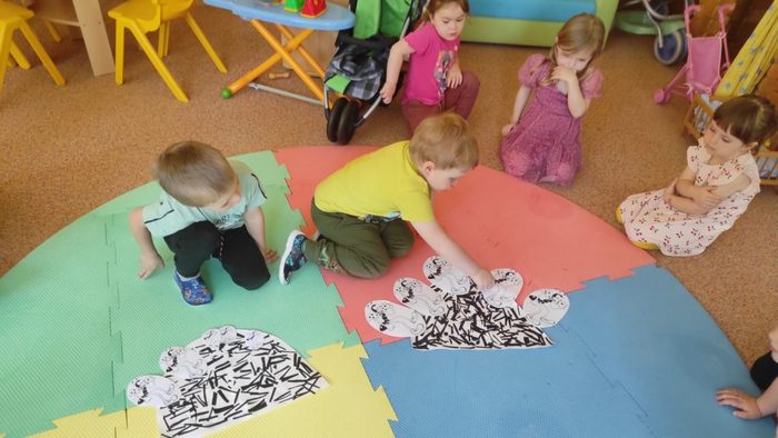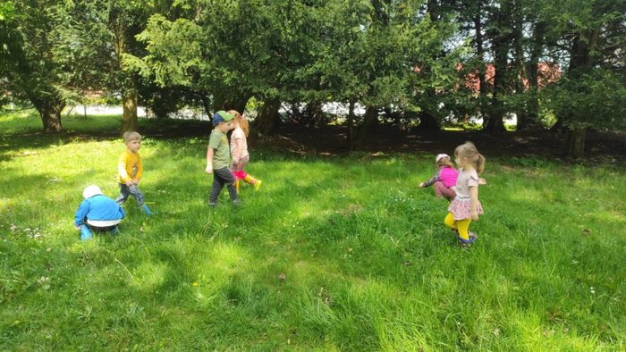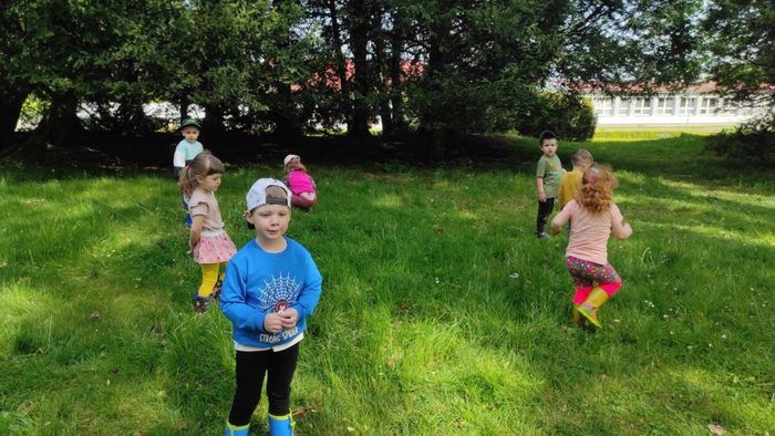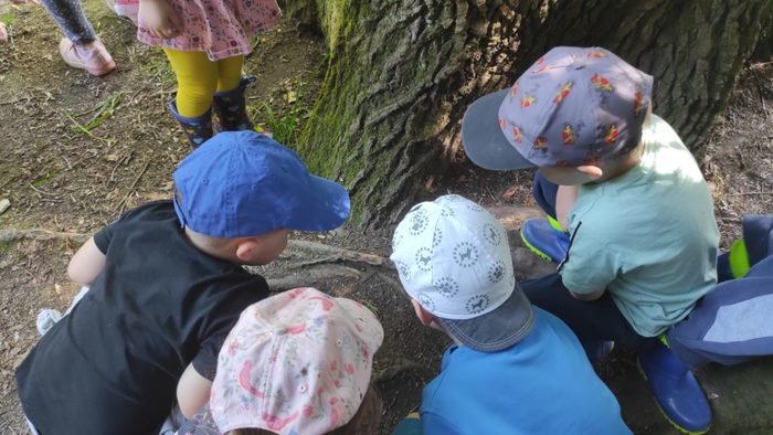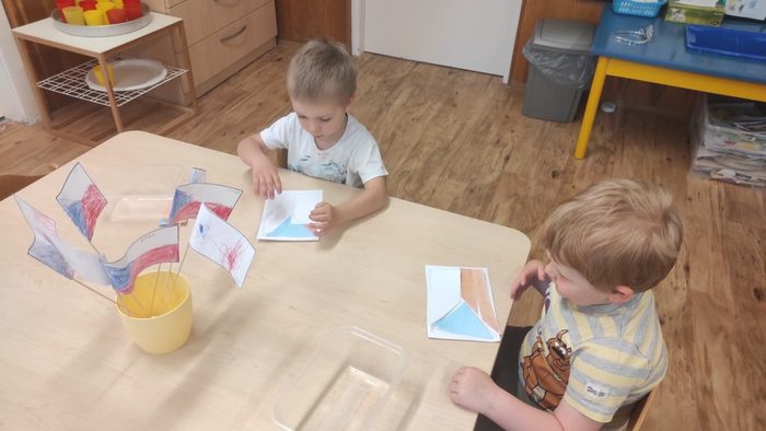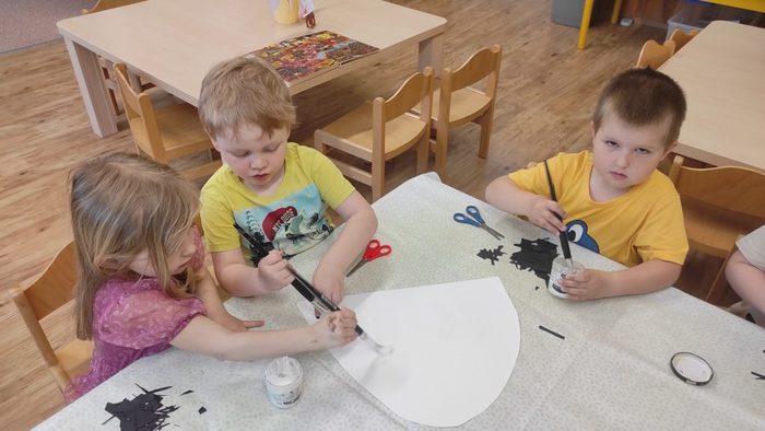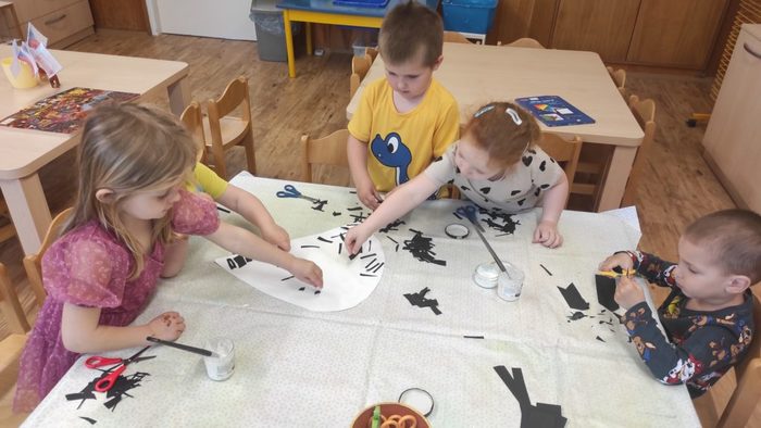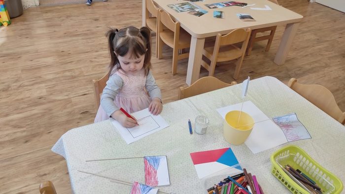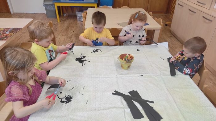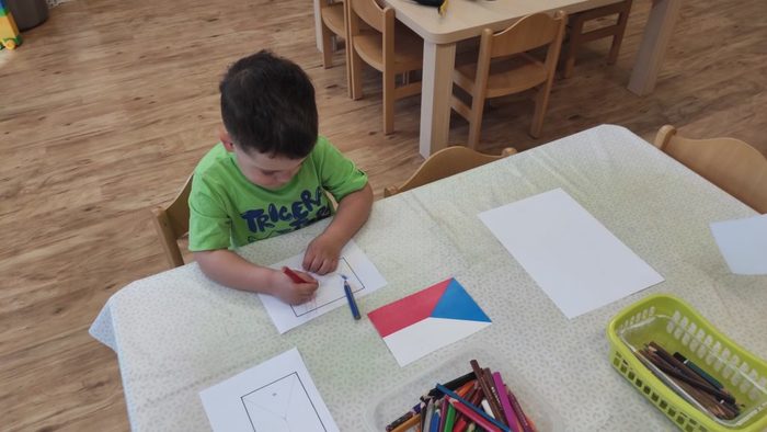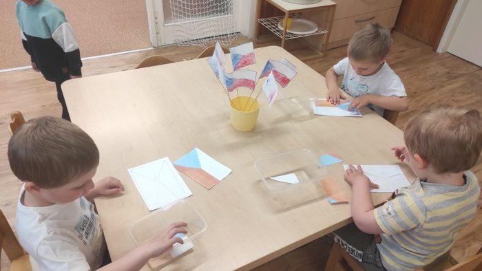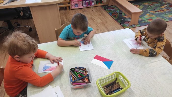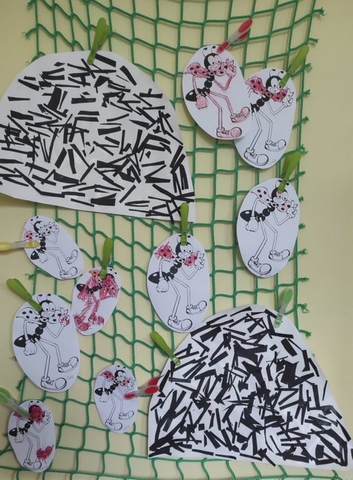 Nejprve jsme se seznámili s Ferdou Mravencem hlavní postavou knihy O. Sekory. Děti stříhaly kousky papíru a jejich nalepením vytvořily pro mravence dvě mraveniště. Společně třídily mravence podle velikosti a počítaly a porovnávaly, množství mravenců. A protože se o mravencích říká, že jsou pilní, využili jsme tuto vlastnost k vysvětlení významu a důležitosti PRÁCE v souvislosti s oslavou Svátku práce. Děti si vyrobily praporek ČR. Také sestavovaly z rozstříhaných částí naši vlajku. Seznámily se s tím, že se vlajka vyvěšuje při významných dnech naší republiky u důležitých budov ve vesnicích a městech. V parku pozorovaly krásy naší přírody.
