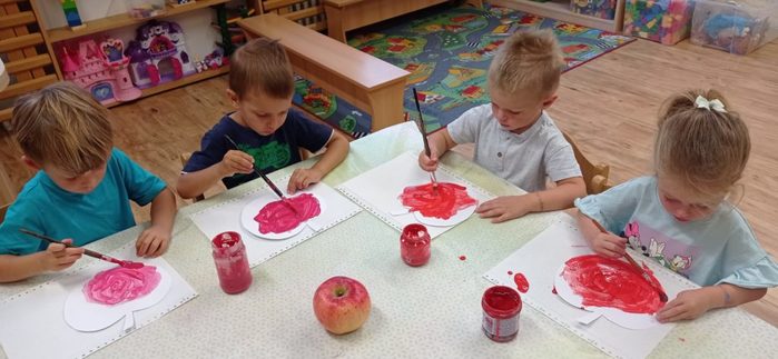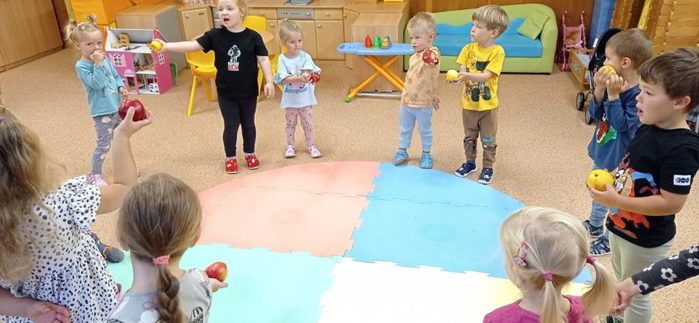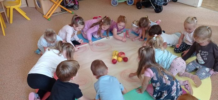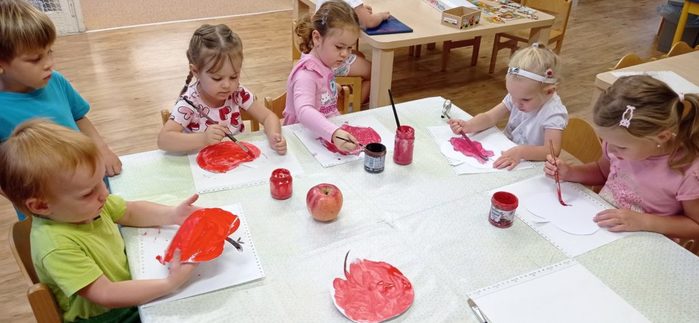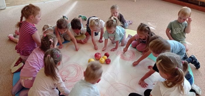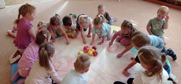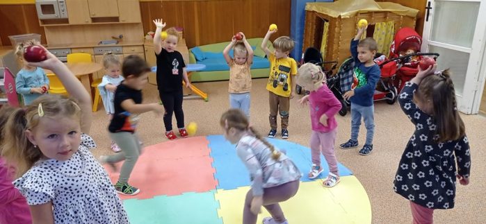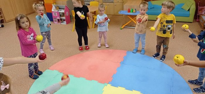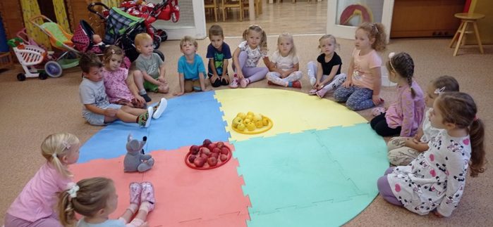 Tento týden si děti vyslechly pohádku O jabloňce. Skládaly puzzle, kde pozorovaly, jak vyroste jabloňka s jablíčky. Malovaly jablíčka barvou, kreslily je na velký formát, Jablíčka z košíku roztřídily podle barvy a rozlišovaly jejich velikost. S jablíčky si zacvičily. Při volných hrách děti vytvořily velmi pěkné stavby.
