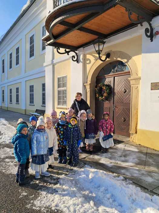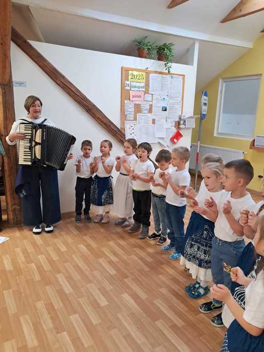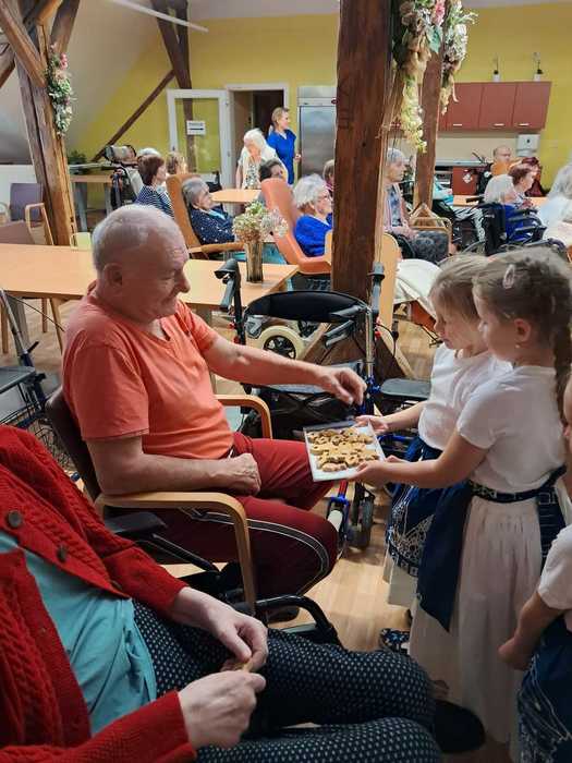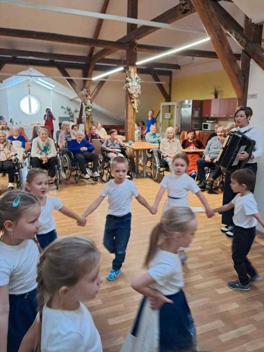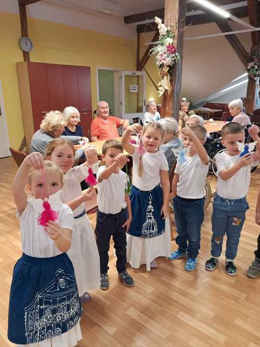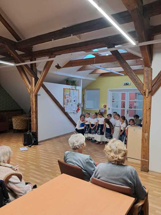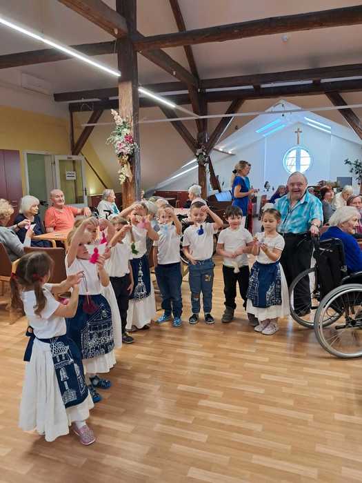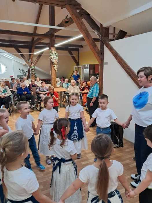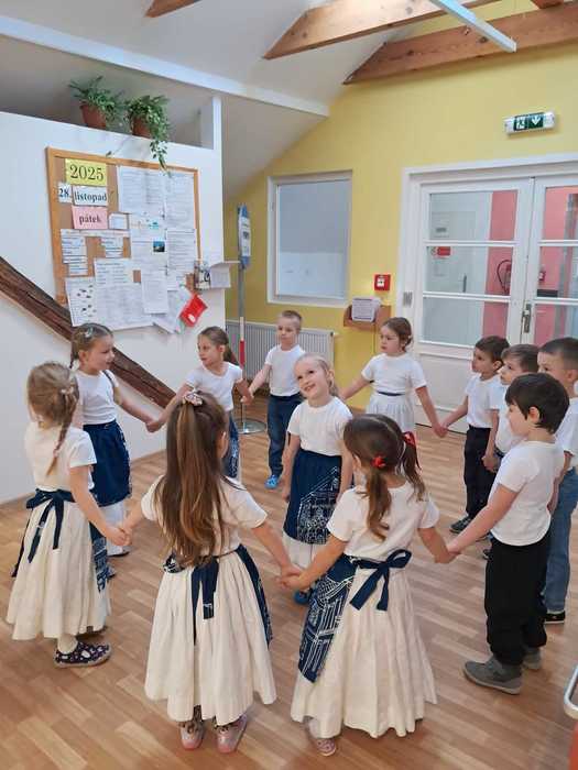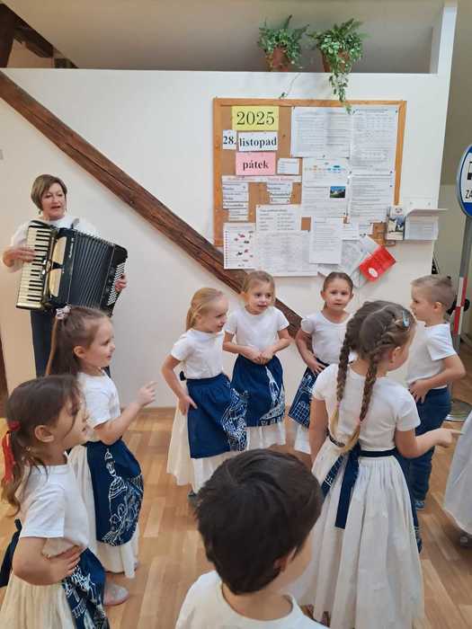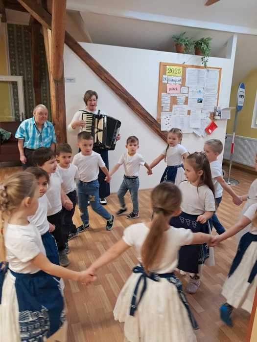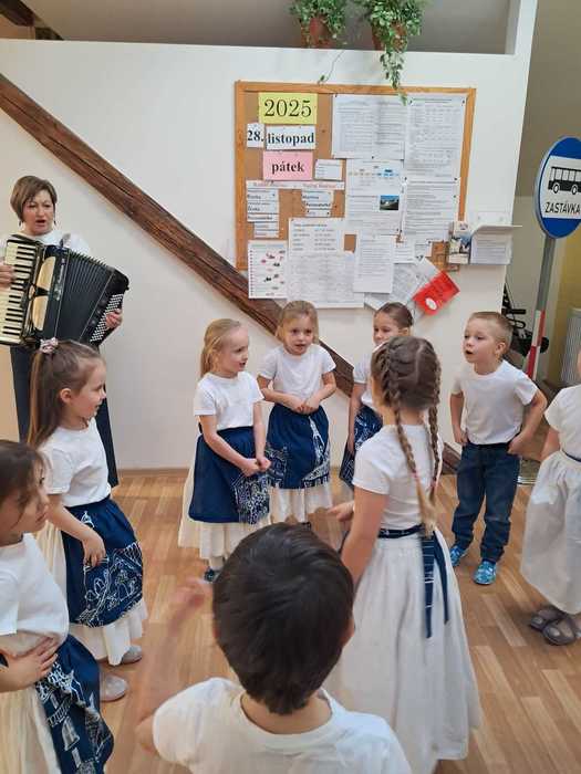 Jejich první vystoupení ve slavnostních krojích bylo sváteční a v doprovodu akordeonu paní učitelky Mirky se zpívalo a tancovalo. Přítomnost našich nejmladších zpěváků a zpěvaček udělalo obyvatelům velkou radost.