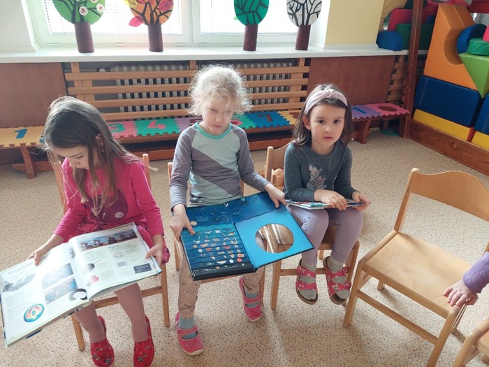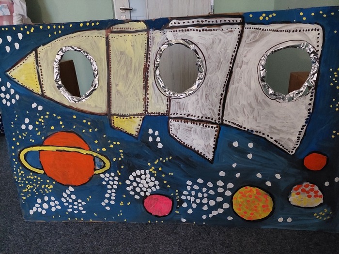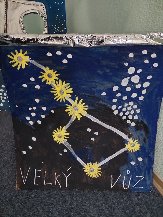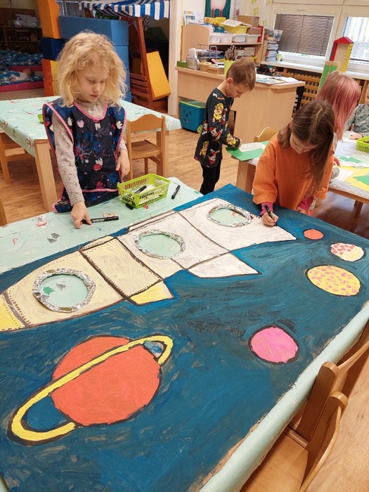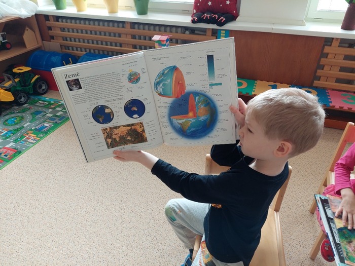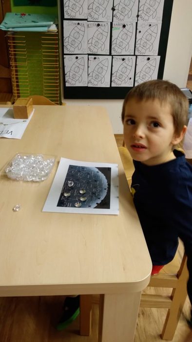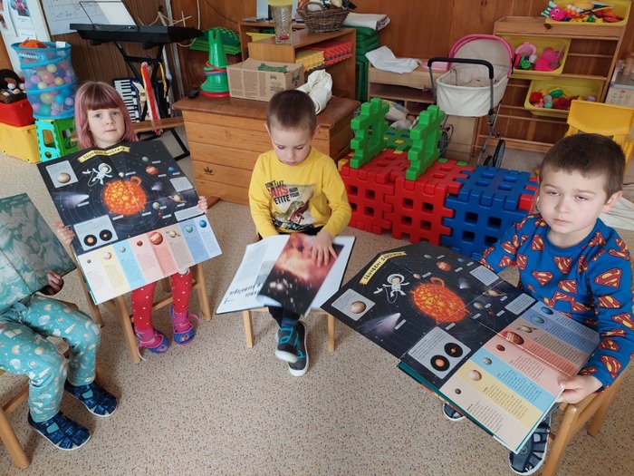Hrály na vesmírné výpravy. Stavěly rakety z kostek i kartonu. Malovaly vesmírnou oblohu. Vyrobily společně vesmírný fotokoutek. V rámci knížečkového čtvrtku děti pracovaly s knihami s tématem vesmíru, slunce, měsíce i planet, které si donesly do MŠ. S tímto tématem jsme hodně využívali interaktivní tabuli. Děti z celé MŠ navštívili Planetárium v Ostravě – Porubě.
