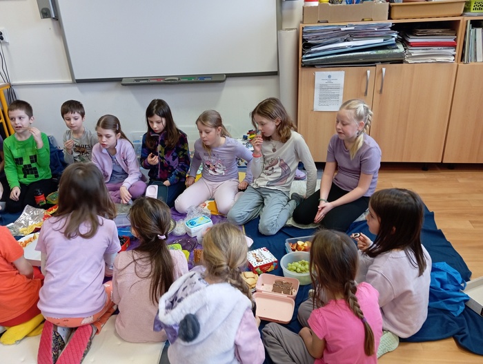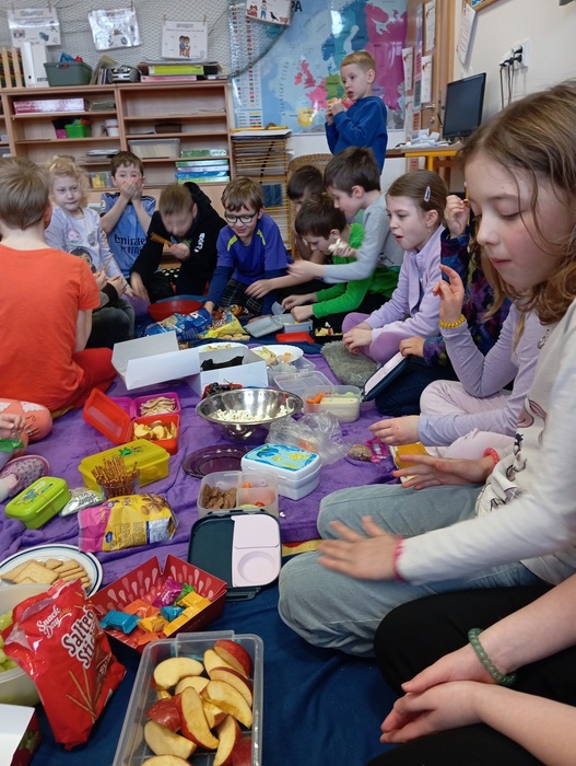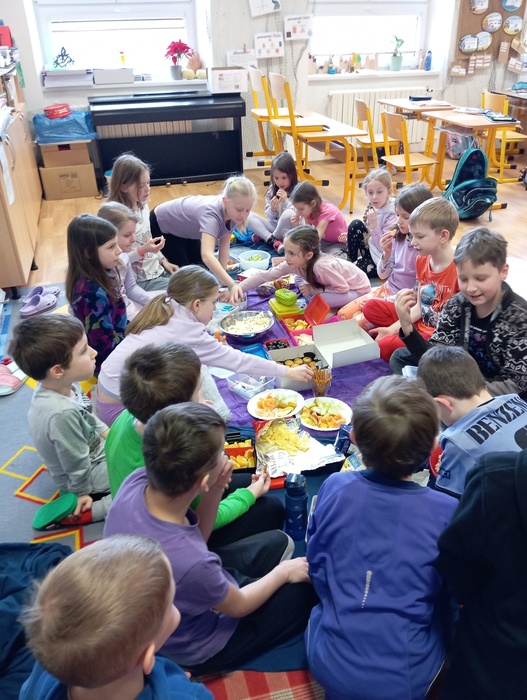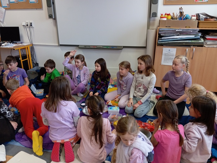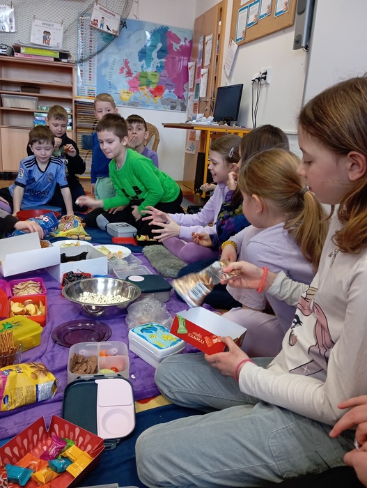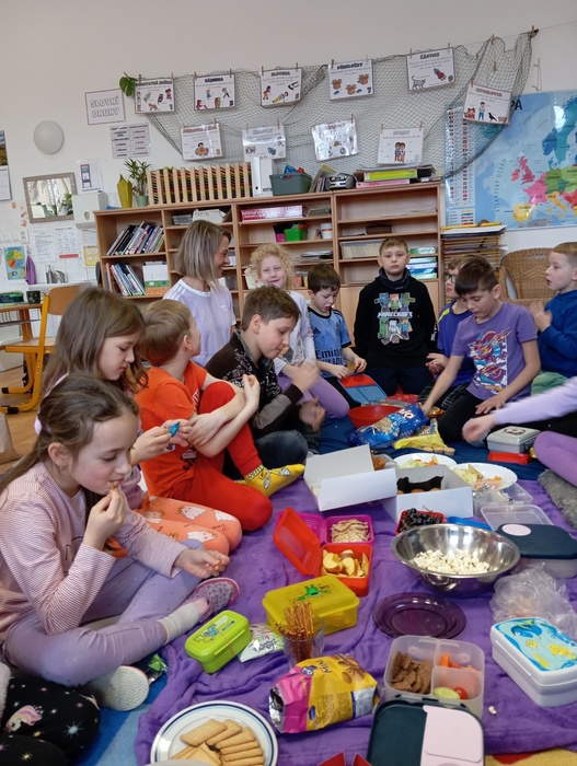 Čtvrtek 13.2. byl dán jako den pro wellbeing - Ve škole se cítíme dobře. Žáci přišli oblečeni do fialové barvy, která byla určena pro tento den na letošní rok. Žáci si přinesli svačiny a různé dobroty, o které se podělili se svými spolužáky.
