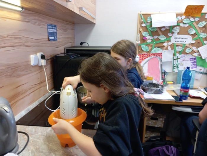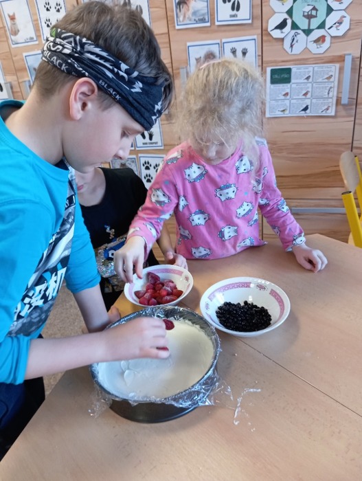 Žáci ve školní družině připravovali ovocný cheesecake. Nakonec žáci připravili dokonce dva cheesecaky plné borůvek a jahod. Jakmile byl dostatečně ztuhlý, jen se po něm zaprášilo. Mňam