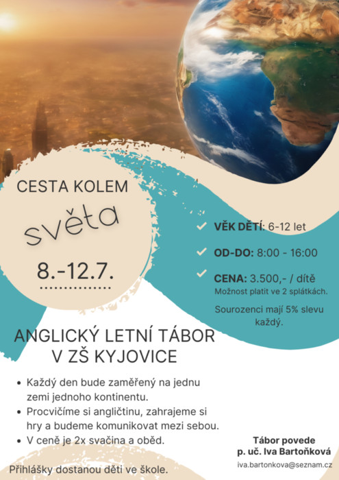 Téma tábora je Cesta kolem světa. Termín od 8. do 12.7., v čase od 8:00 do 16:00. Cena za tábor, včetně oběda a svačin, je 3.500,-. Budete mít možnost platby ve 2. splátkách, přes internetové bankovnictví, a sourozenci mají oba 5% slevu.