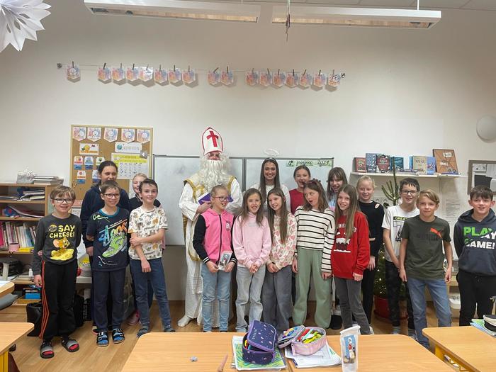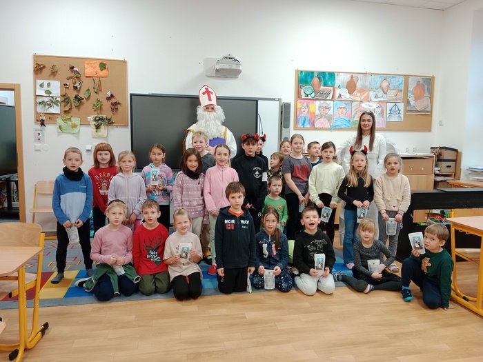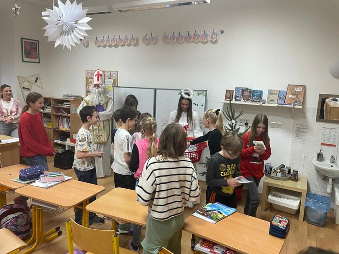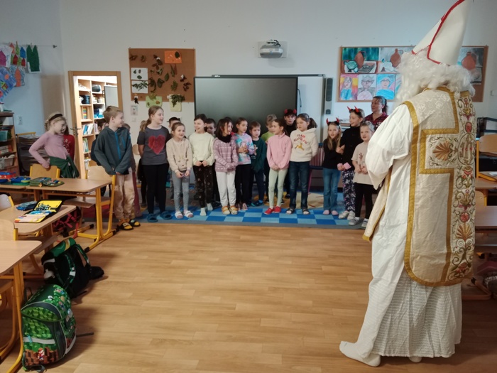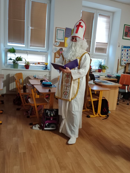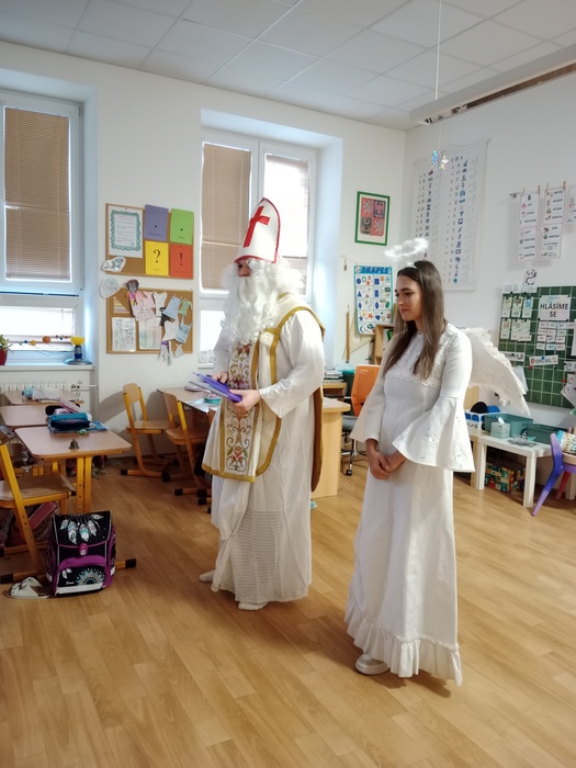 Dne 5. prosince zavítal do naší školy vzácný host - Mikuláš v doprovodu anděla. Společně navštívili jednotlivé třídy, kde je děti přivítaly s nadšením, úsměvem i trochou zdravého napětí. Mikuláš děti pochválil za jejich snahu a dobré skutky, anděl je povzbudil milým slovem a nechyběly ani básničky, písničky či krátká povídání. Odměnou byly drobné sladkosti a krásná atmosféra, která připomněla blížící se vánoční čas.