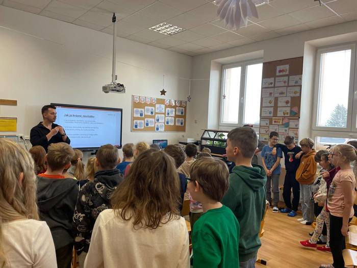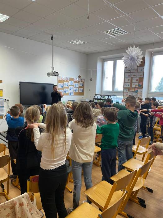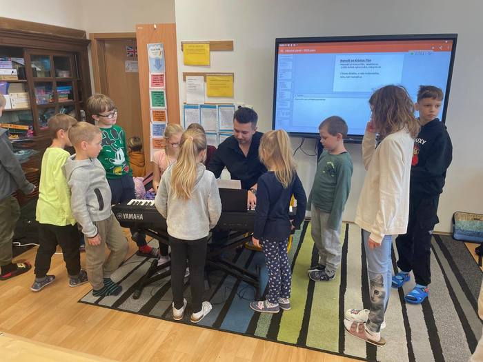 V pondělí 24.11. k nám dorazil sbormistr, aby s dětmi vedl tříhodinový hudební workshop. Letos se totiž u nás všechno točí kolem hudby.